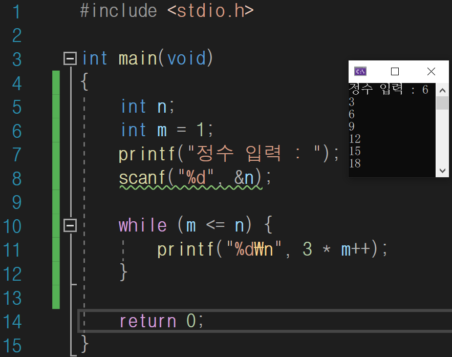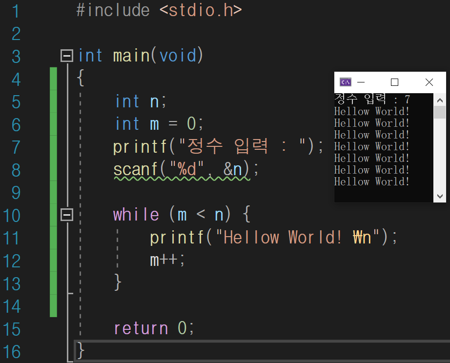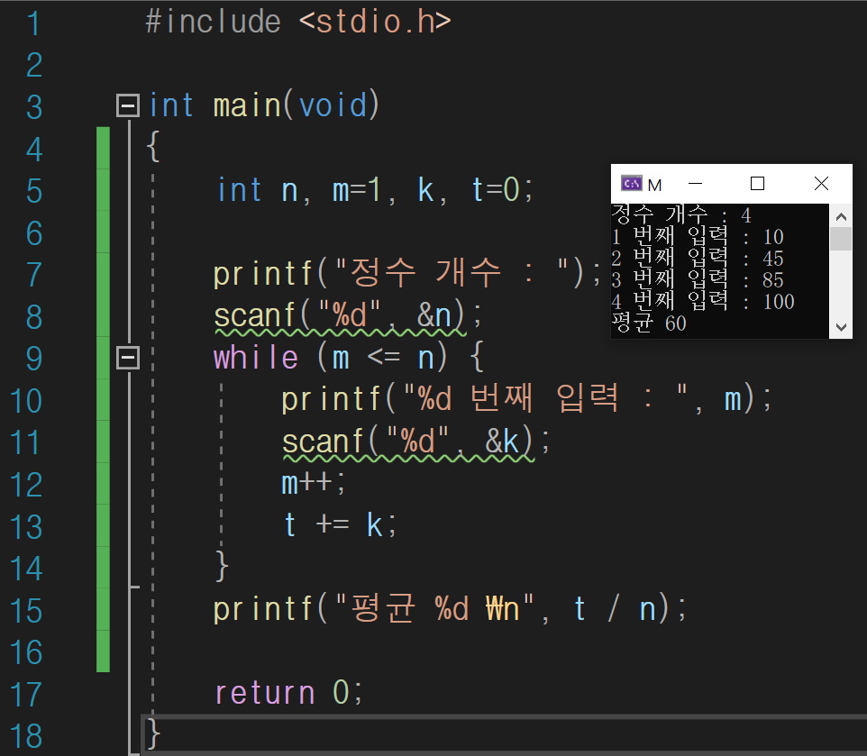 while (m <= n) { //아래 m++ 할 필요 없이 (m++ < n) 해도 됨