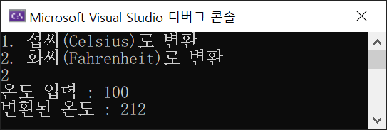 printf("1. 섭씨(Celsius)로 변환\n2. 화씨(Fahrenheit)로 변환 \n");