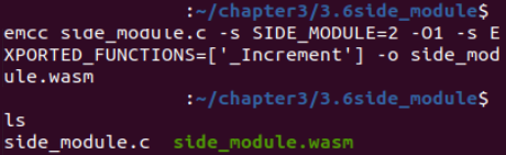 emcc side_module.c -s SIDE_MODULE=2 -O2 -s EXPORTED_FUNCTIONS=['_Increment'] -o side_module.wasm