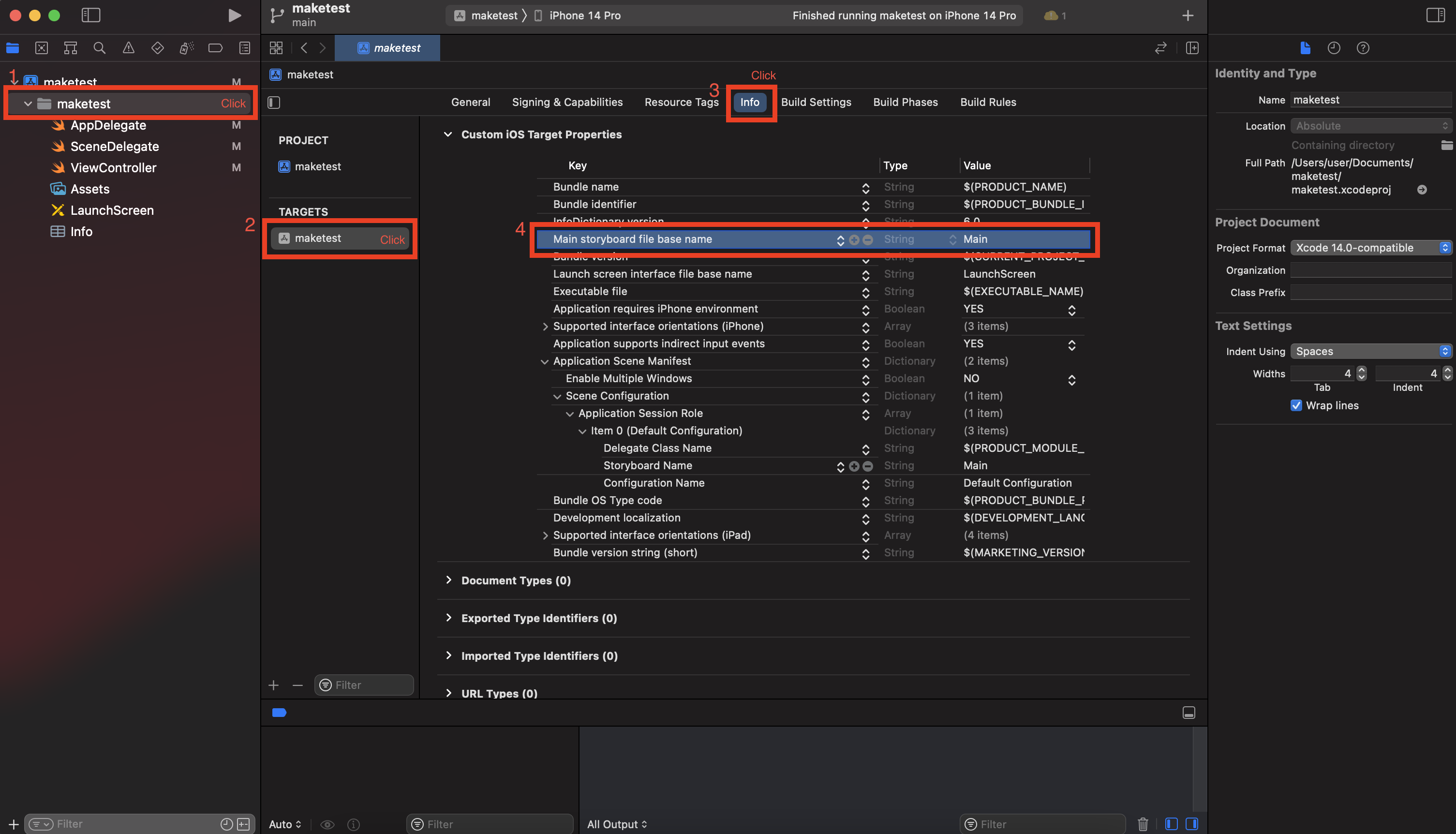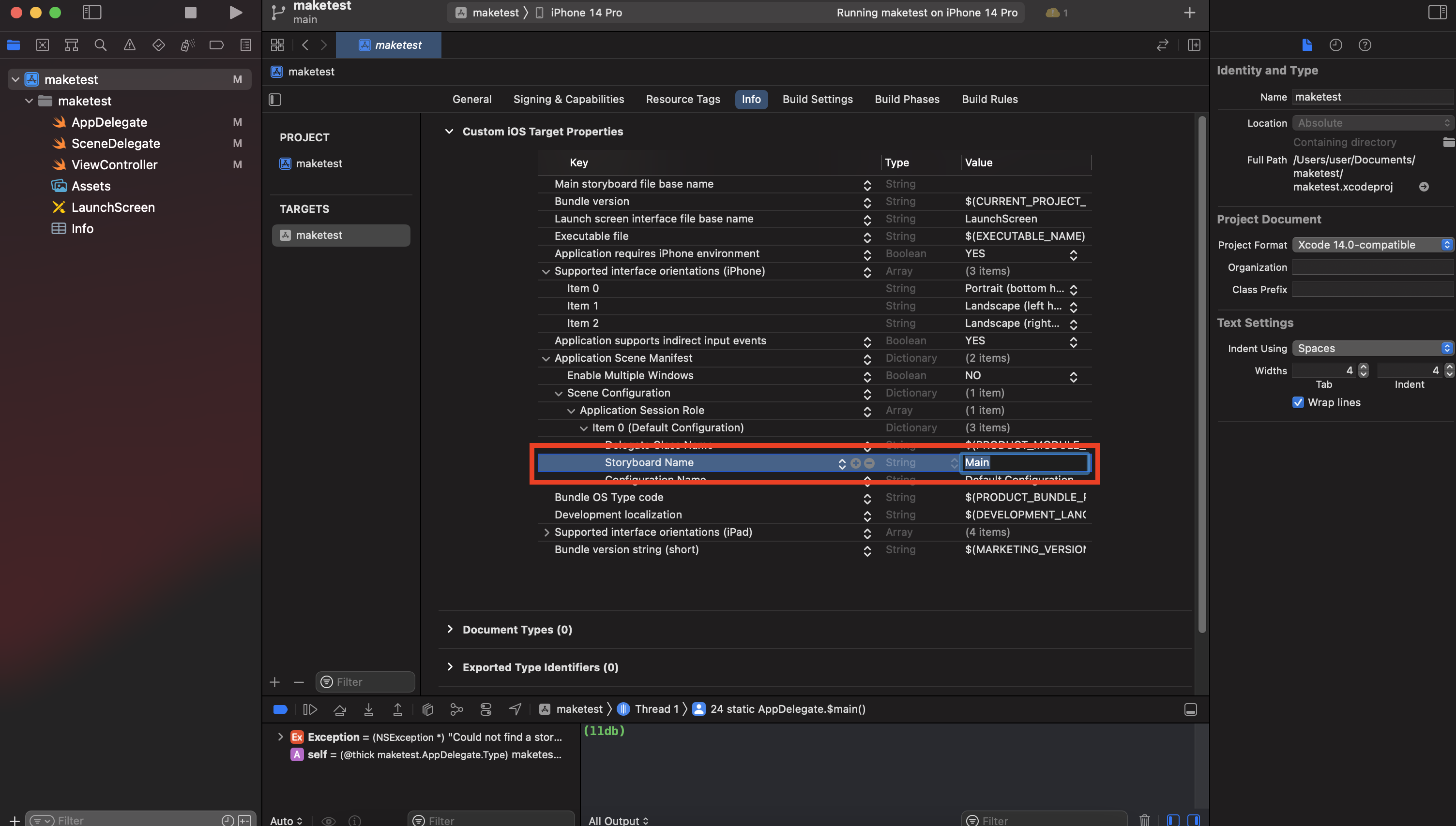 Info 아래 Main stroyboard file base name, Application Scene Manifest의 목록들을 확장하다보면 Storyboard Name에 Main이라 써있는 것들 공백으로 만들면 된다.