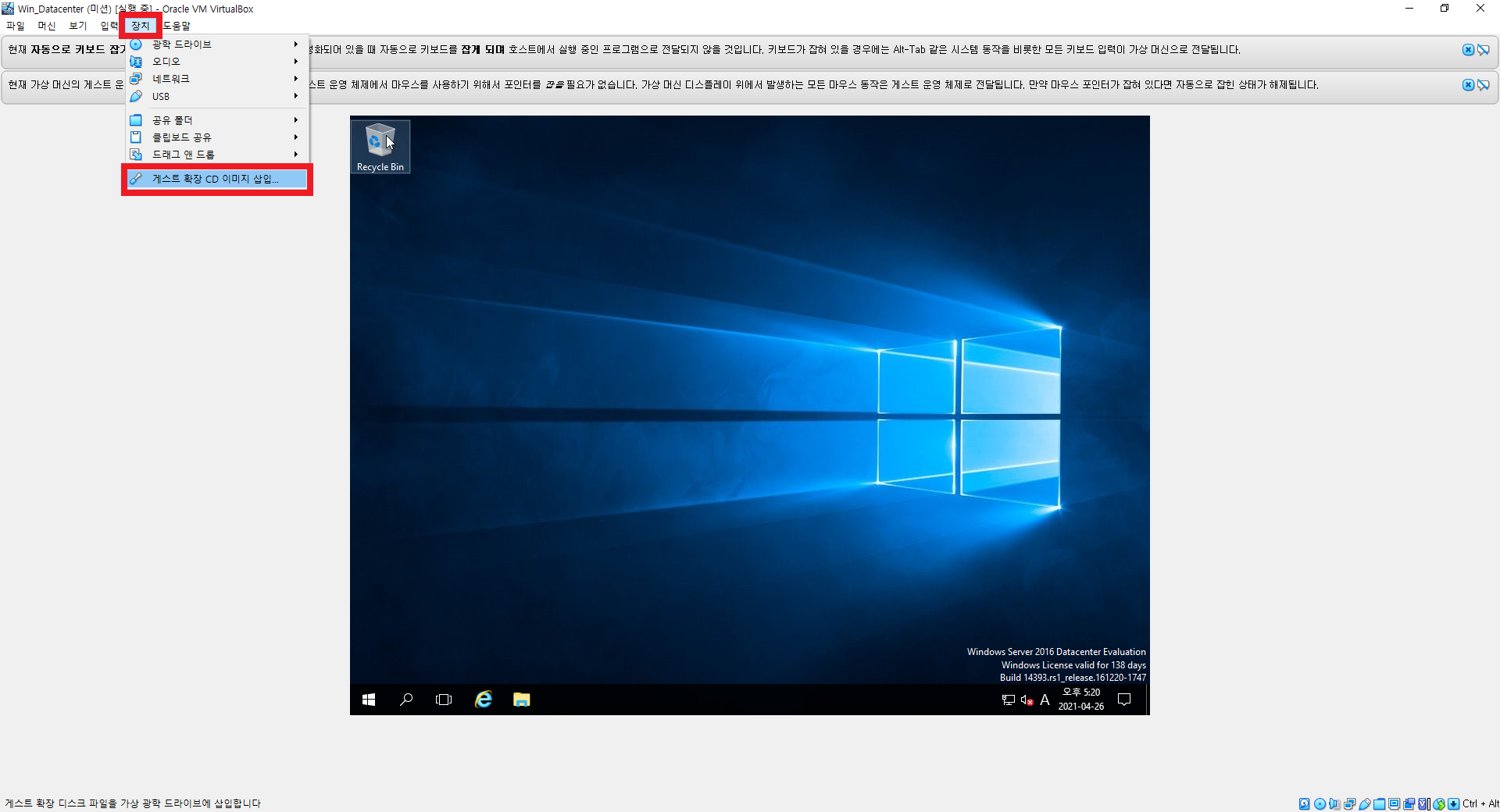 8. 장치 클릭 → 게스트 확장 CD 이미지 삽입... 클릭