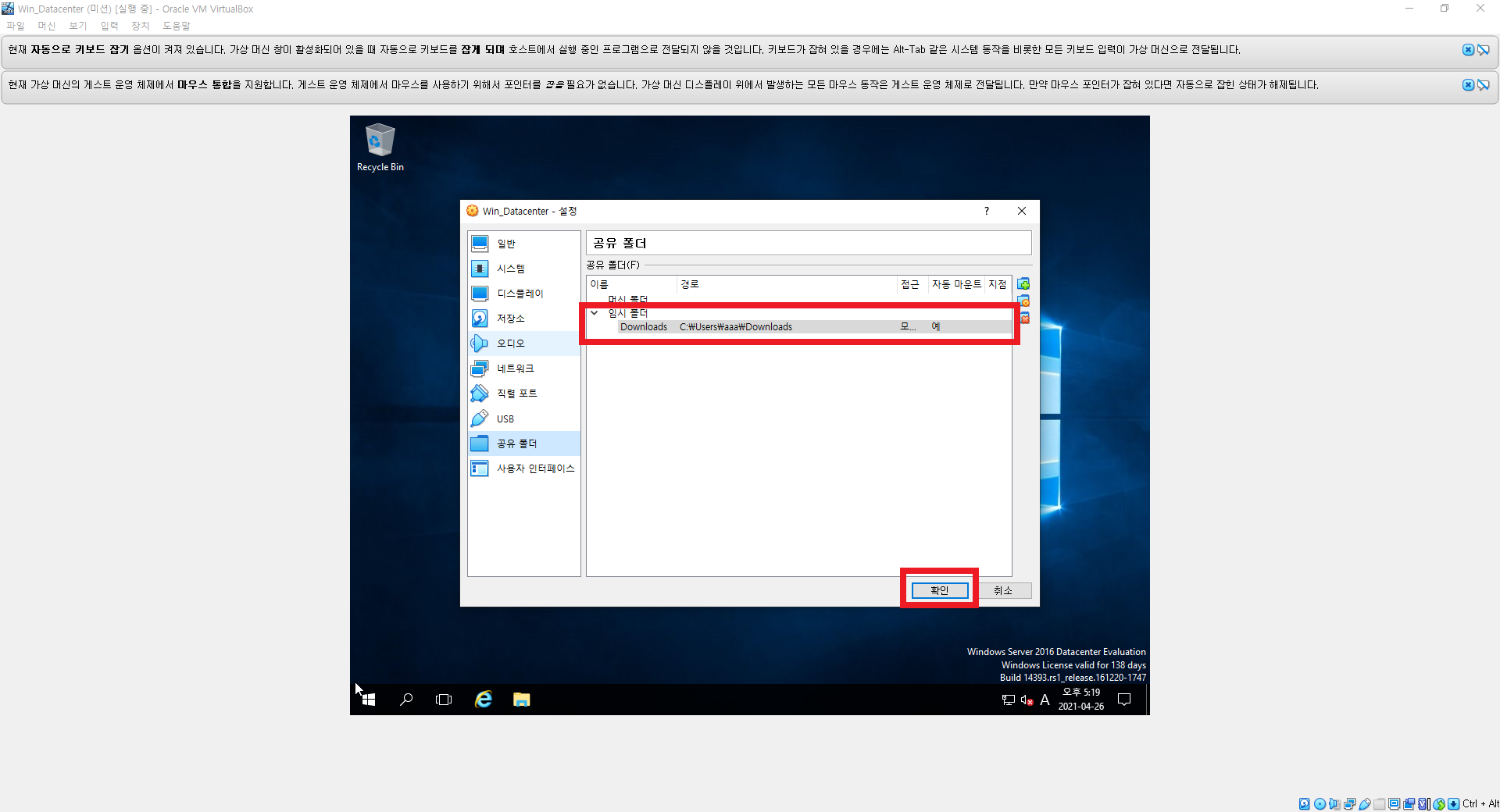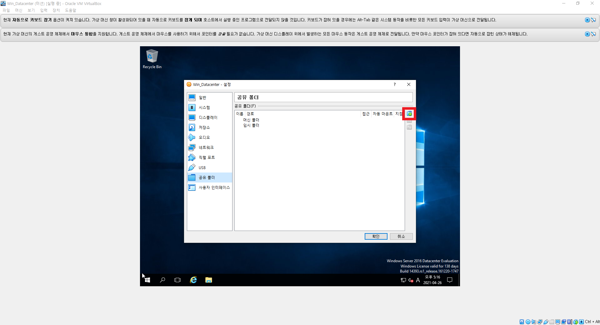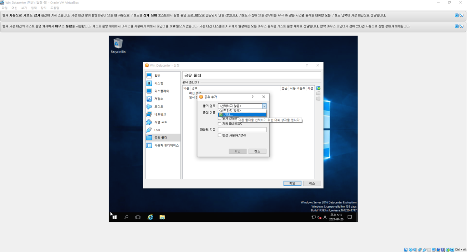컴퓨터에 저장되어있는 파일을 가상머신에서 사용하기 위해서는 공유 폴더 설정을 해야 한다.