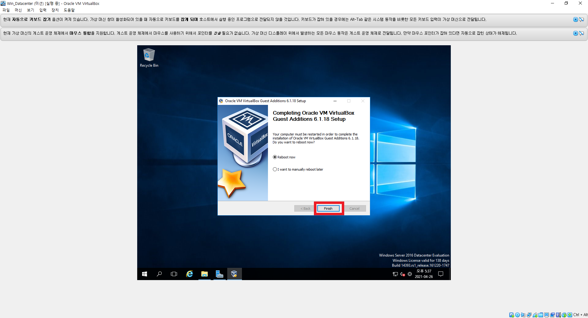 13. Finish 버튼 클릭 후 재부팅하면 끝!