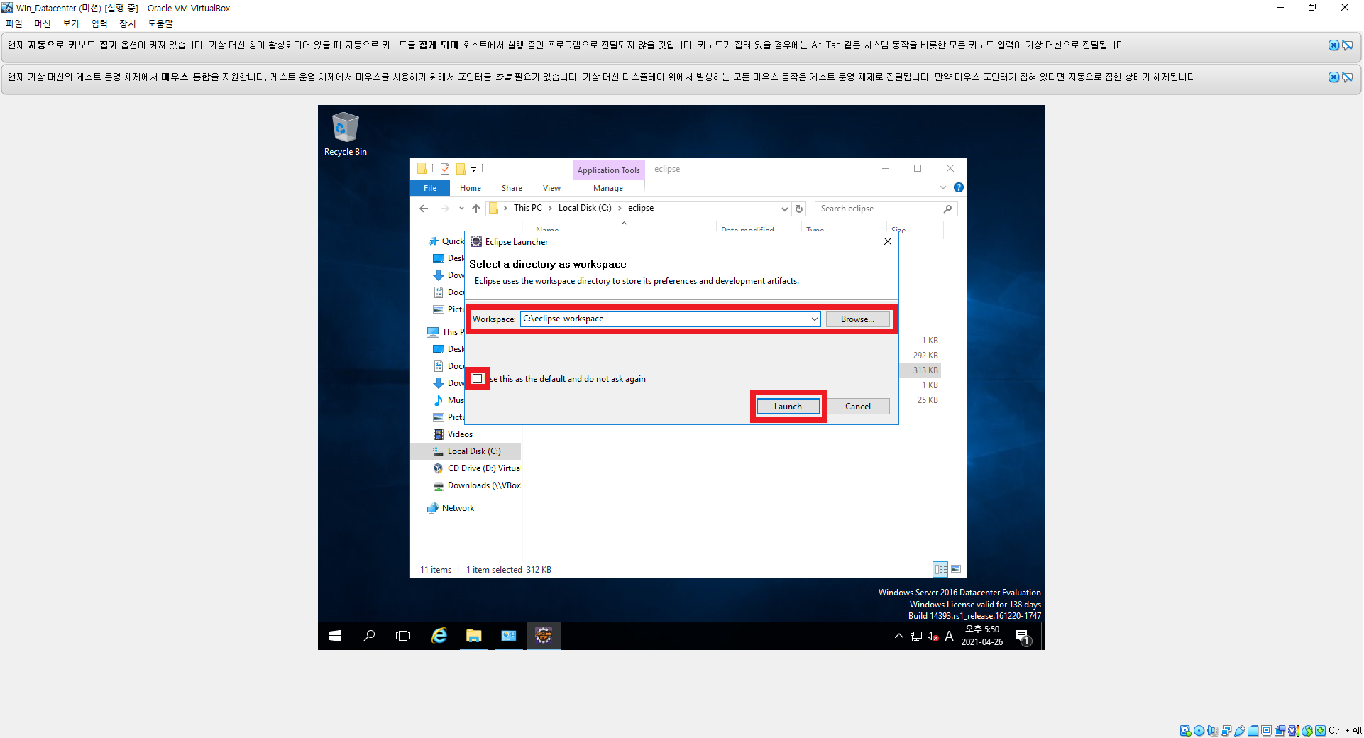 4. WorkSpace 지정 → 아래 체크는 원하면 해도 됨 → Launch 버튼 클릭