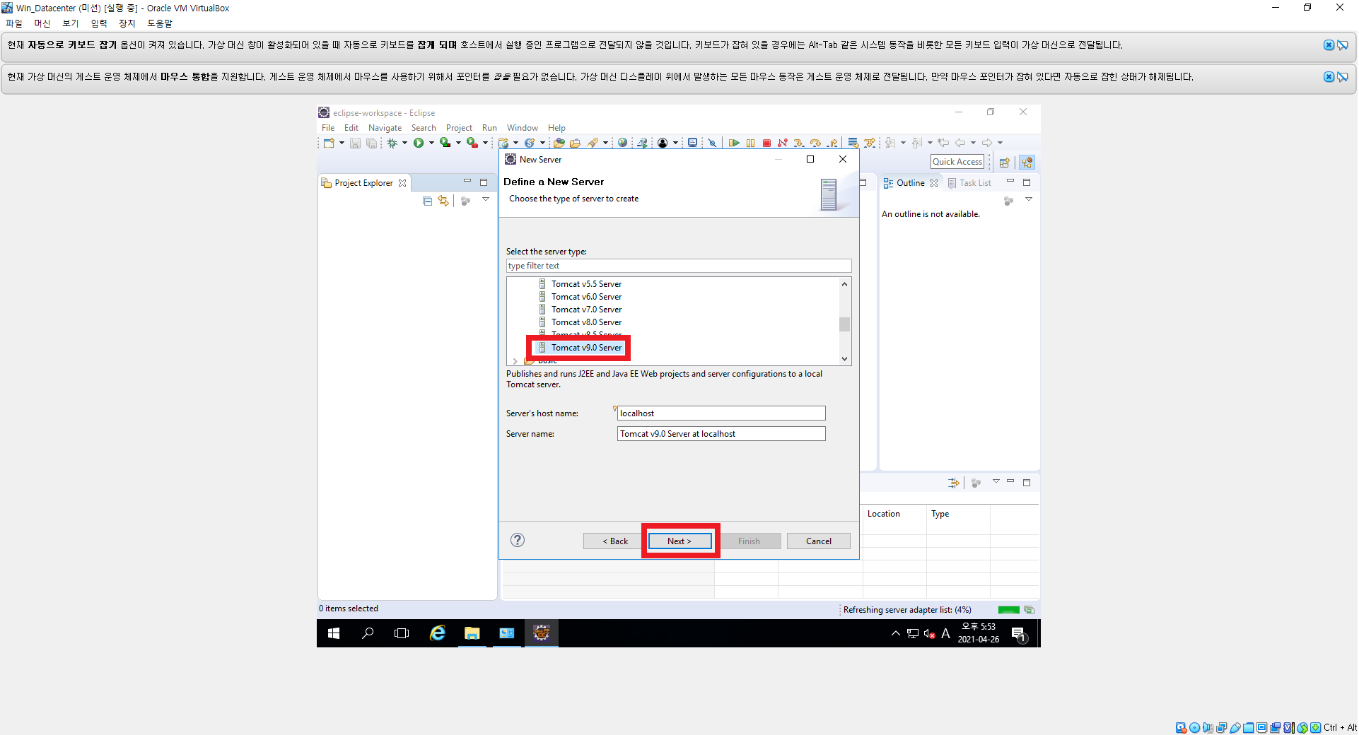 7. Tomcat v9.0 Server 선택 후 Next 버튼 클릭