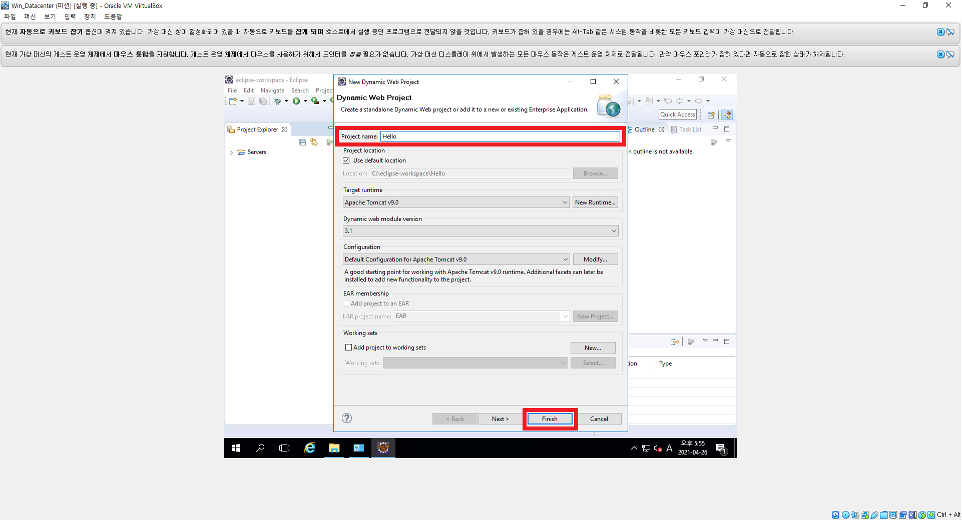 10. 프로젝트 이름을 지정한 후 Finish버튼 클릭