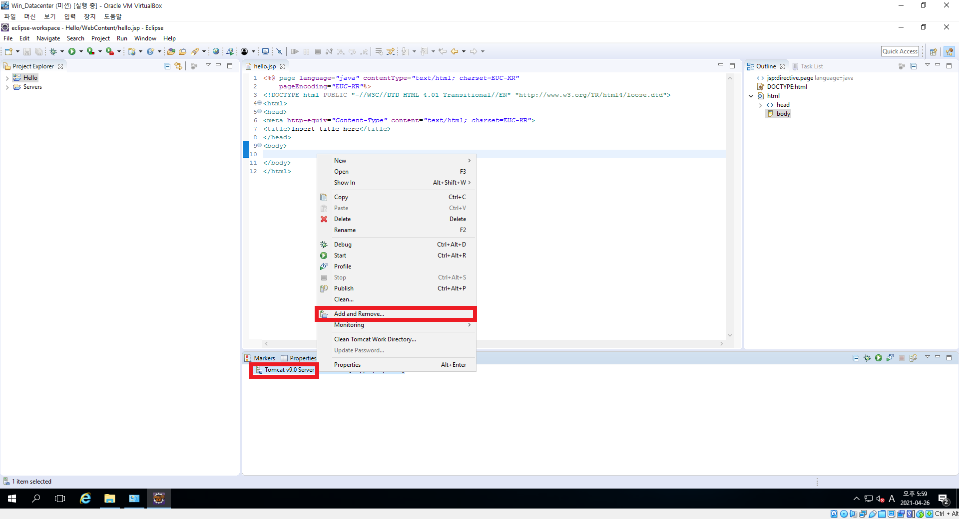 14. Server 아래 톰캣에 우클릭 → Add and Remove 클릭