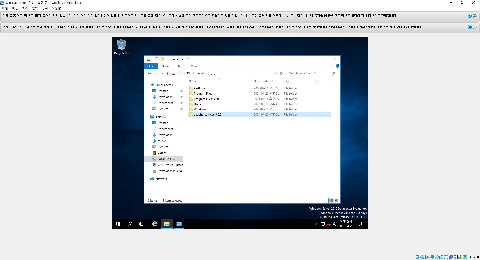 1. 공유 폴더에서 apache-tomcat-9.0.2 폴더를 C드라이브에 넣어야 함.