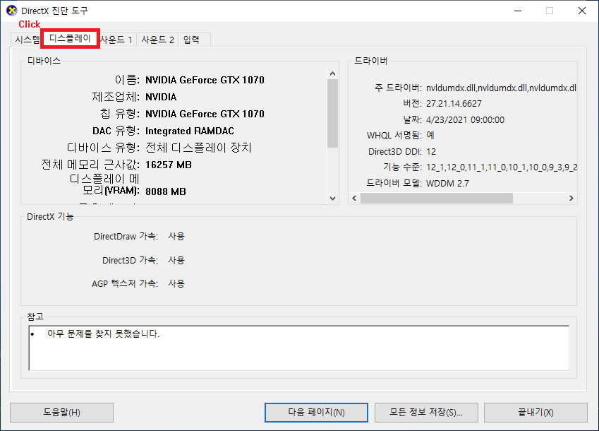 ② DirectX 진단 도구 창이 뜨면 상단 메뉴 중 디스플레이 클릭
