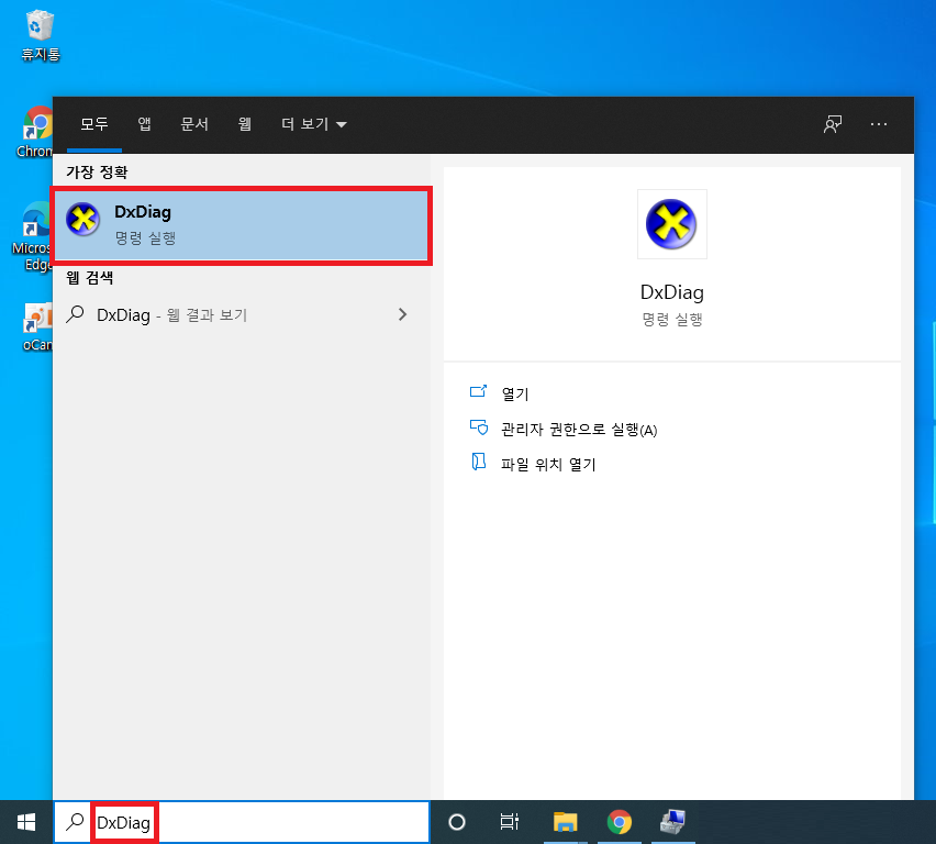 ① 시작 옆 돋보기 그림이 있는 검색란에 dxdiag 검색