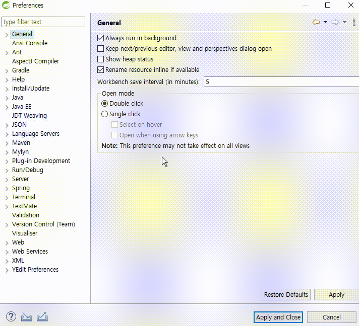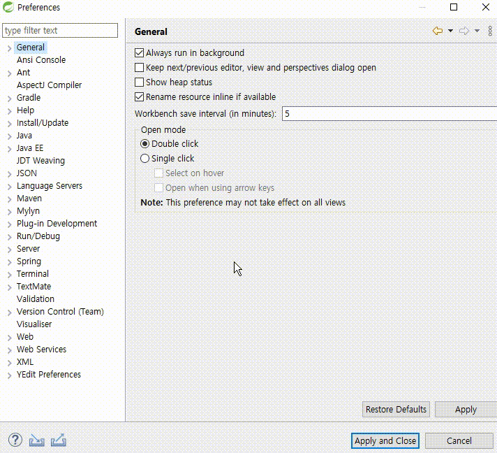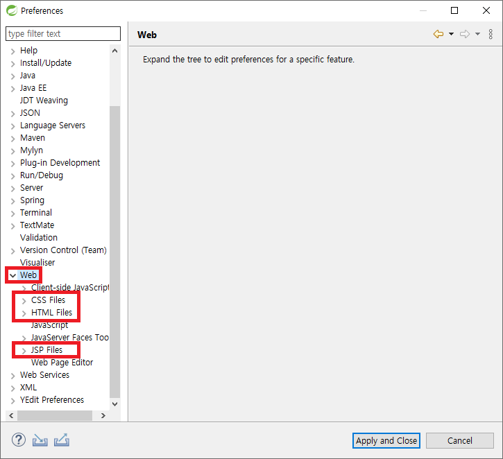 3) Web - CSS Files, HTML Files, JSP Files 각각 변경 → Apply and Close 클릭하여 닫기