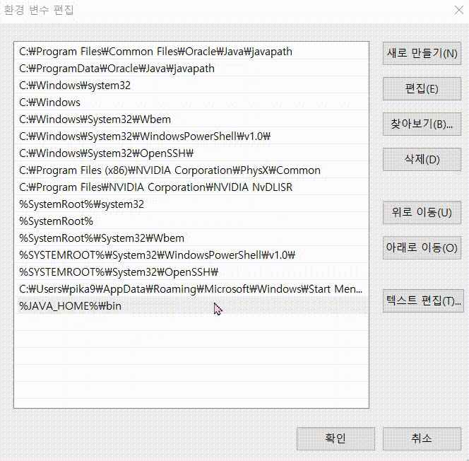 9) %JAVA_HOME%\bin이 없다면 오른쪽 '새로 만들기(N)' 클릭하여 만들고 제일 위로 올려주기