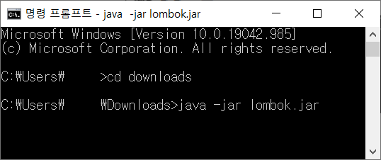 cd downloads 입력 → java -jar lombok.jar 입력