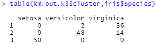 table(km.out.k3$cluster,iris$Species)