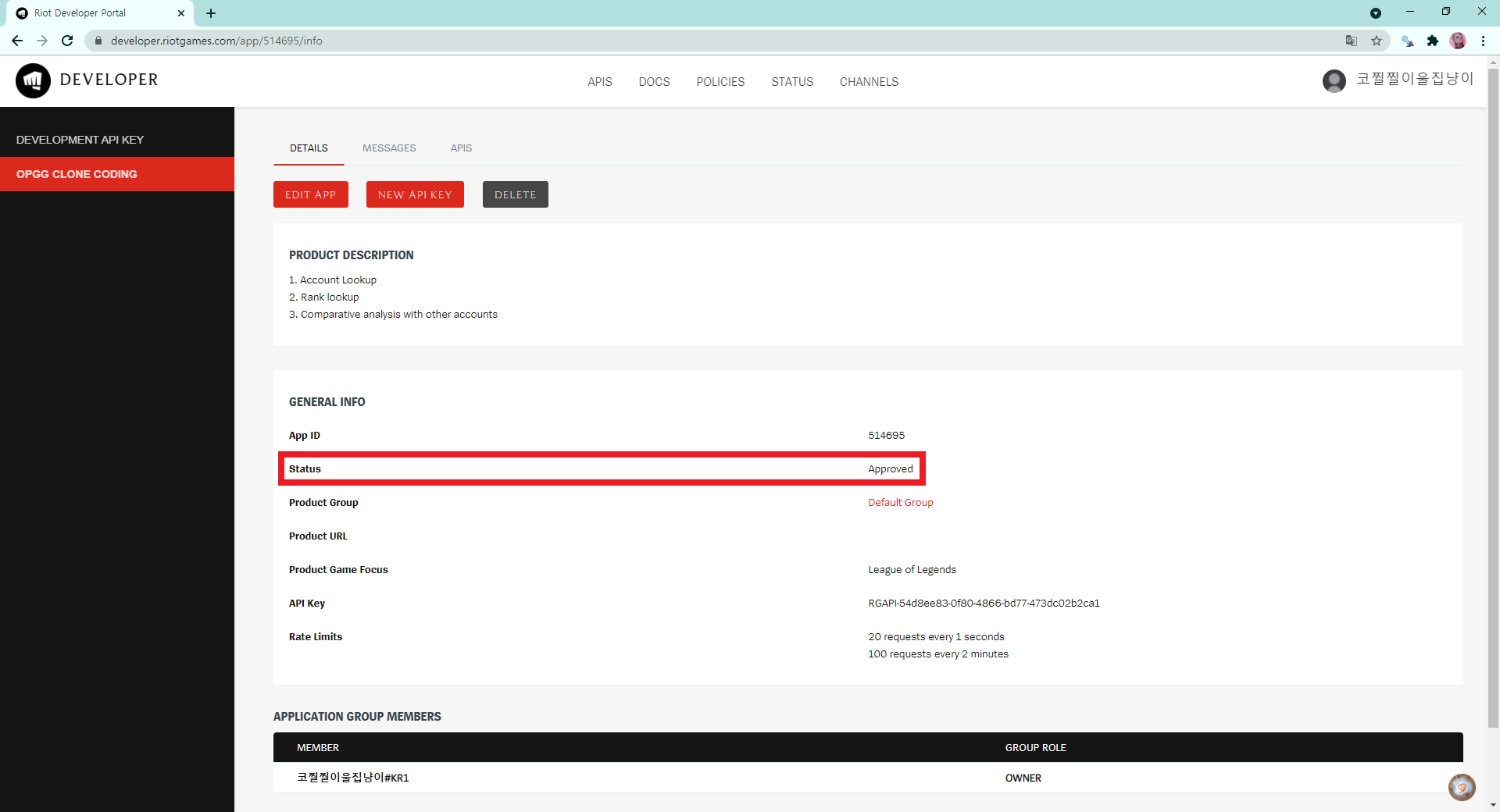 - PRODUCTION API KEY : 대규모 커뮤니티 또는 인터넷 전체를 대상으로하는 제품에 사용